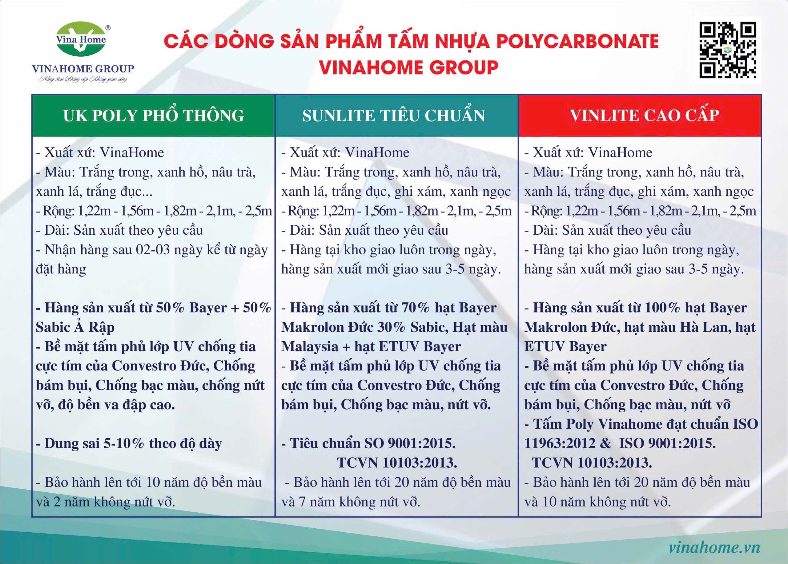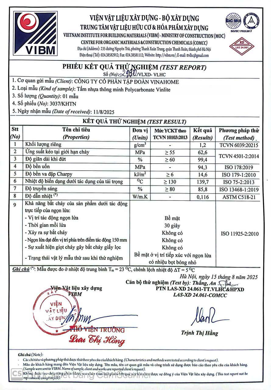 - 100% Sản phẩm tấm Poly được chứng nhận tiêu chuẩn chất lượng trước khi xuất xưởng: Nhằm đảm bảo chất lượng sản phẩm tấm lợp Poly đến tay nhà thầu, chủ đầu tư và quý đại lý, toàn bộ sản phẩm tấm Poly trước khi xuất xưởng sẽ được VinaHome đảm bảo về khả năng lấy sáng, chống cháy, chịu lực đạt tiêu chuẩn TCVN 10103:2013 - Theo ISO 11963:2012