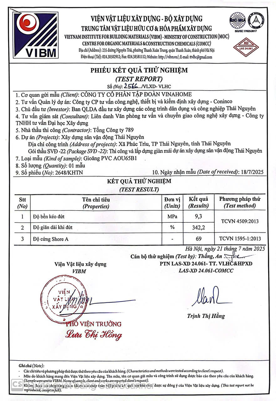 Phiếu kết quả thư nghiệm nẹp hợp kim nhôm.