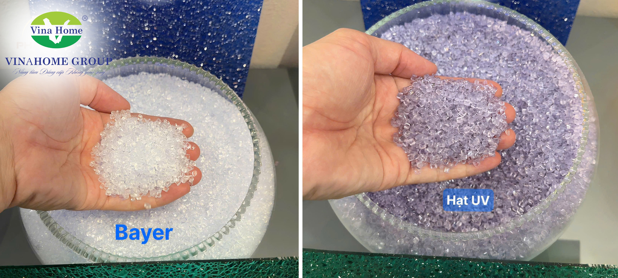Tại Việt Nam, chúng tôi tự hào là đơn vị độc quyền sử dụng 100% hạt nhựa Bayer Đức – dòng hạt nhựa nguyên sinh tốt nhất thế giới hiện nay. Điều này tạo nên sự khác biệt hoàn toàn về chất lượng: tấm nhựa có độ trong suốt như kính, dẻo dai và khả năng chịu lực gấp 200 lần kính thường. Nhờ đó mà tấm nhựa poly Vinahome thường có màu sắc trong hơn, tươi mới hơn so với dòng nhựa poly ngoài thị trường có màu hơi “xỉn”, mức độ trong suốt kém.