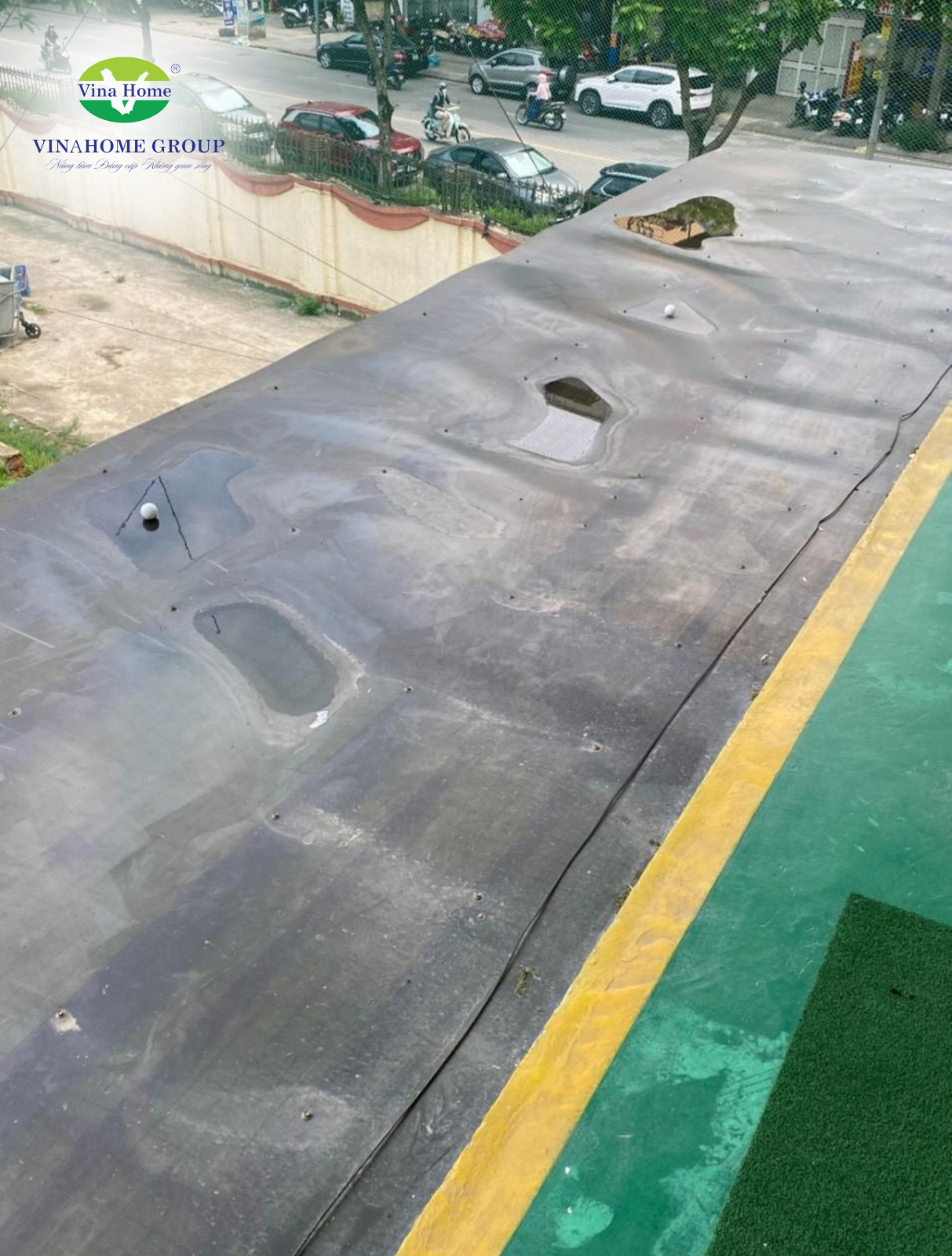 Nghiêm trọng hơn, lớp nhựa Polycarbonate vốn được quảng cáo là "không thể phá vỡ" lại trở nên cực kỳ giòn và dễ nứt. Chỉ cần một tác động nhẹ từ vật cứng, sức gió lớn hoặc những trận mưa rào, tấm nhựa có thể xuất hiện các vết nứt chân chim, rạn toác hoặc thậm chí là vỡ vụn thành từng mảnh.
