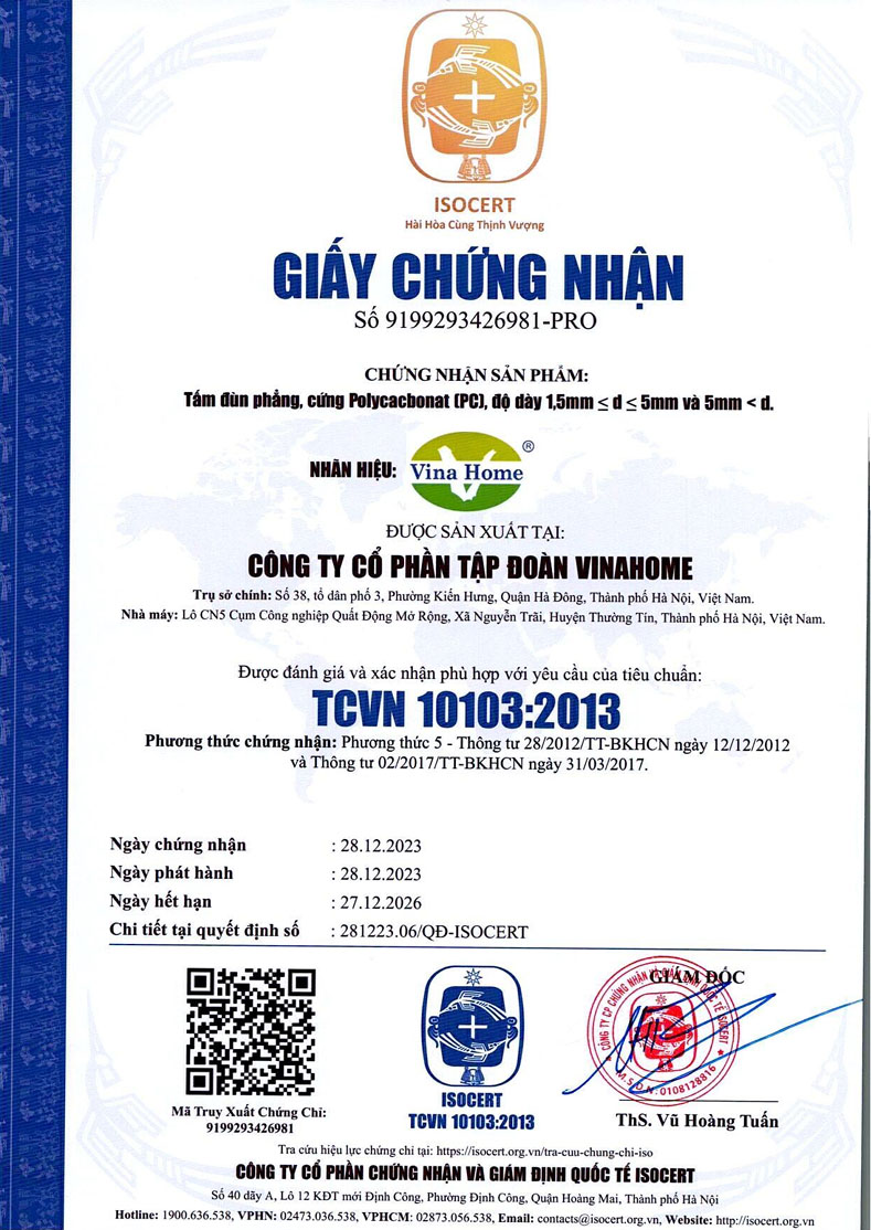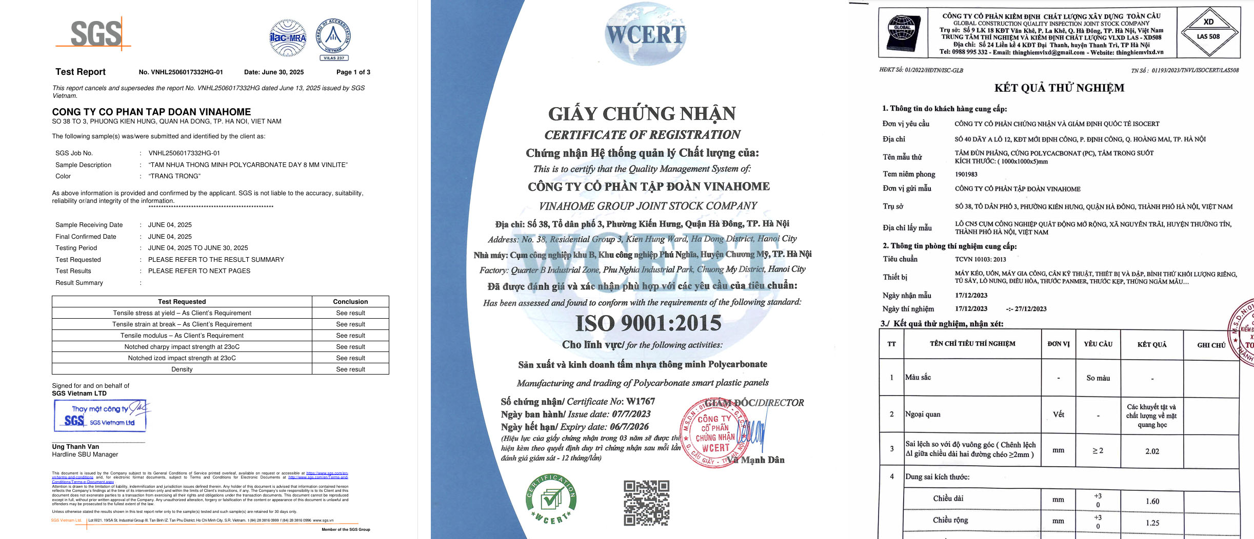 Những chứng nhận này không chỉ là "tấm vé thông hành" cho sản phẩm tấm poly Vinahome, mà còn là lời cam kết mạnh mẽ của Vinahome về tính minh bạch, nguồn gốc xuất xứ rõ ràng và chất lượng vượt trội đã được kiểm chứng.