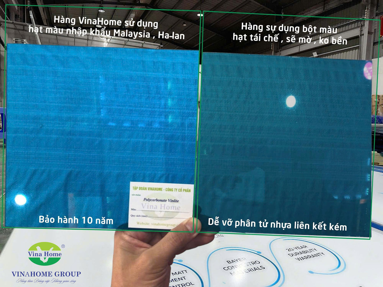 Hình ảnh so sánh thực tế chất lượng tấm nhựa poly Vinahome Bayer Đức và hàng ngoài thị trường sử dụng nhựa thường