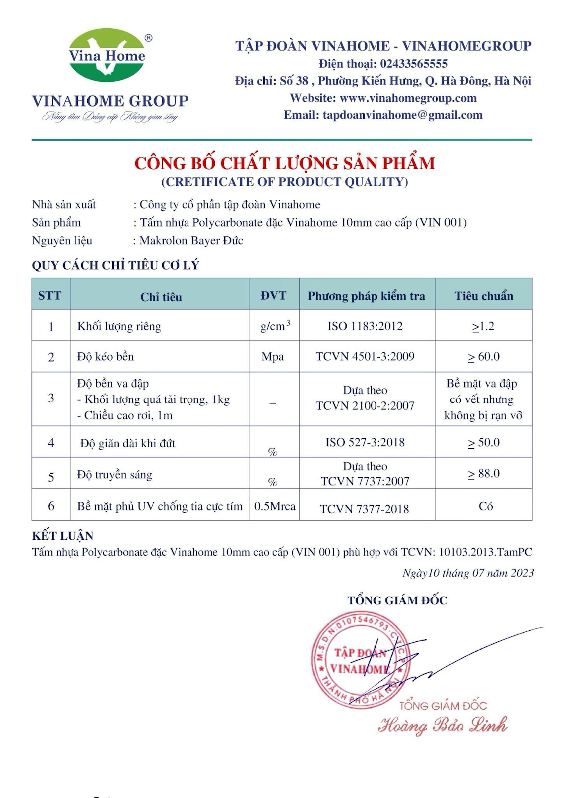 Chứng nhận công bố chất lượng sản phẩm tấm poly Vinahome